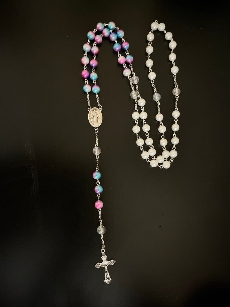 These extremely lightweight rosaries are elegant and a reminder of a waters beauty. These artifical pearls are smooth and magestic.